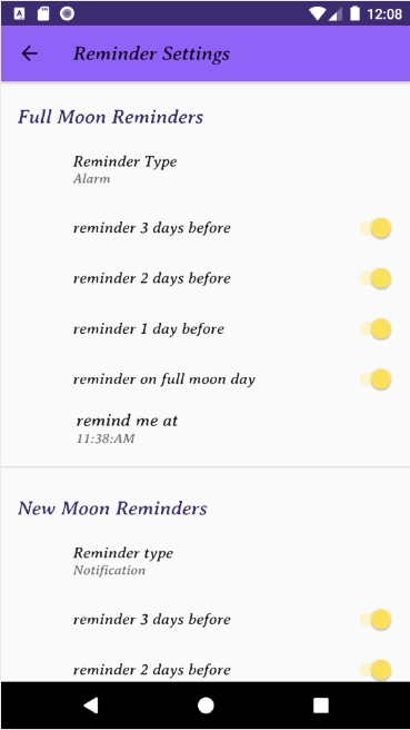 Supports reminders in both notification style or alarm style. Full moon and new moon reminders both supported.